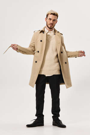 man in a beige coat fashionable hairstyle for autumn style Studio in full growth