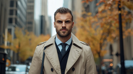 A man wearing a tan trench coat and a blue shirt with a tie. He is standing in front of a tree with yellow leaves