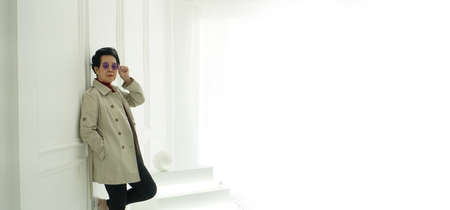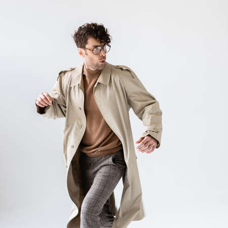 Portrait of young trendy man in beige trench coat over white background