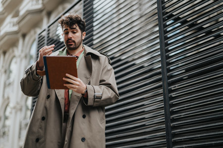 Man in a trench coat using a tablet while standing outside near a modern building