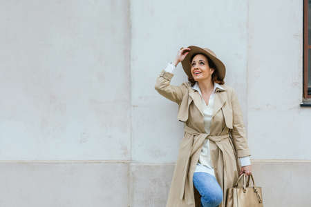 Middle age women goes through the city and smiles. Happiness concept.
