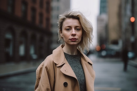 A blonde woman wearing a tan coat stands on a city street. She is looking straight ahead and she is in a serious mood