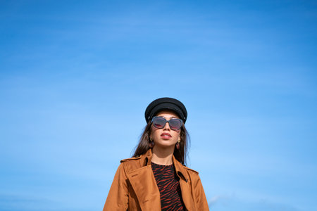Female portrait of a beautiful young woman of Caucasian appearance in a black cap against a blue sky in sunglasses and a jacket