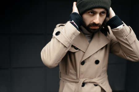 man holds his hand near his face fashionable hairstyle coat lifestyle