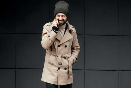 image of a young, smiling, happy, laughing man with a beard in a raincoat with a phone on a gray background on the street. Positive human emotions, facial expression, reaction, attitude