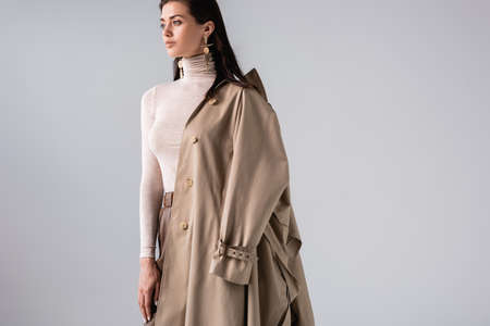 attractive, trendy woman with trench coat on shoulder posing isolated on gray