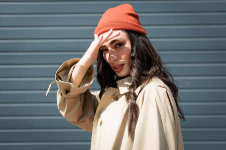 stylish woman in trench coat and beanie hat standing with hands in pockets near building