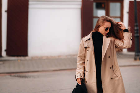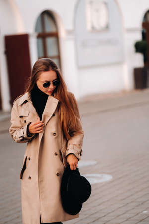Beautiful young woman in trench coat walking in the city, autumn season.