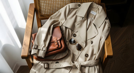 A stylish top-down arrangement of a beige trench coat, a brown leather satchel, and sunglasses on a wooden cane chair. The composition represents classic fall fashion and a sophisticated travel lifestyle.