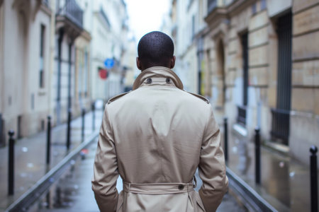 Stylish black male model wearing a beige trench coat on a gray background, showcasing confidence and modern fashion trends