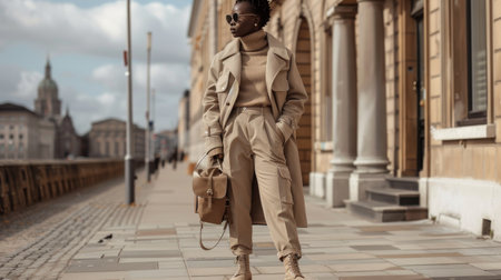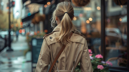 Woman wearing a trench coat walking along a bustling city street, capturing urban life