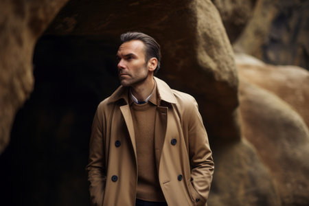 Portrait of a handsome man in a beige coat standing in an underground cave