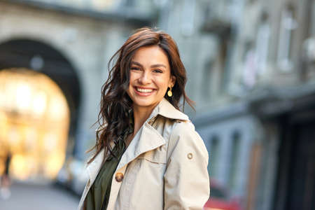 Portrait of a happy young woman in a beige coat on the street.