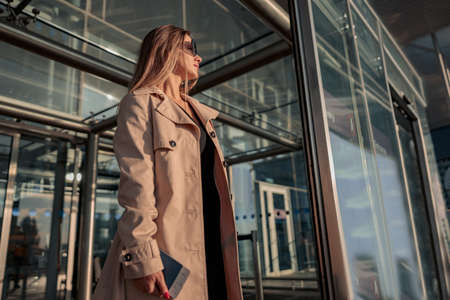 Female traveler in trench coat with a suitcase leaving the airport terminal