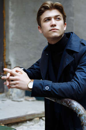 Close-up portrait of a handsome stylish man in a coat on the street