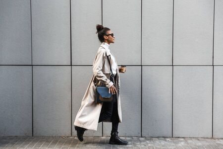 Full length of a smiling attractive young african woman wearing autumn coat walking outdoors, holding takeaway coffee cup