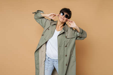 Mature european woman smiling while posing in coat isolated over beige background