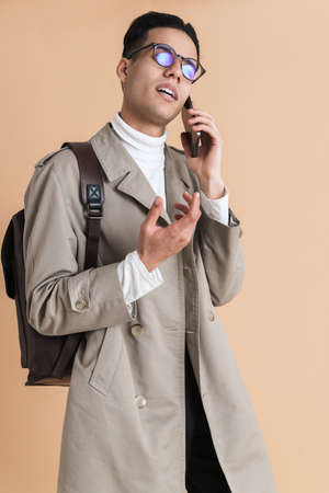 Young middle eastern man wearing coat talking on mobile phone isolated over beige background