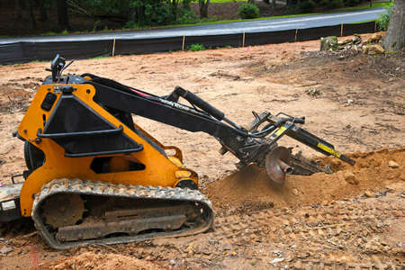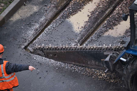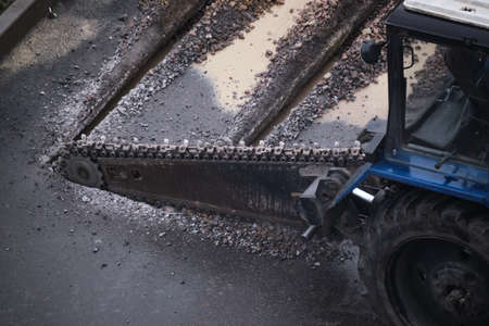 chain trench excavator, trencher, bar aggregate, soil cutter in the middle of cutting the road asphalt into pieces.