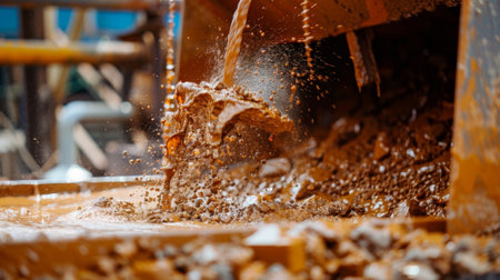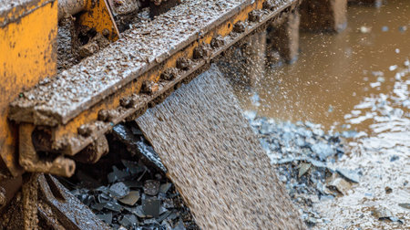 Close-up view of industrial machinery in action, discharging materials into a muddy environment. The image captures the essence of construction work and machinery operation.