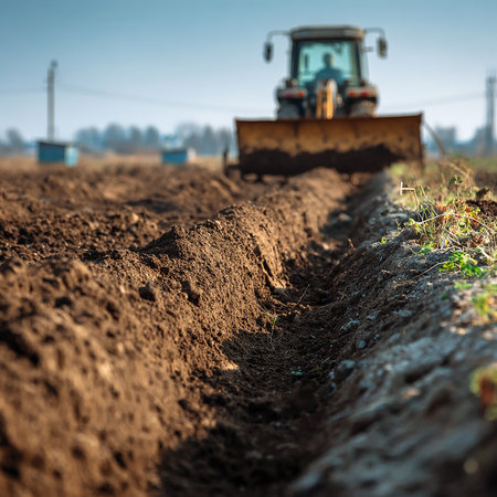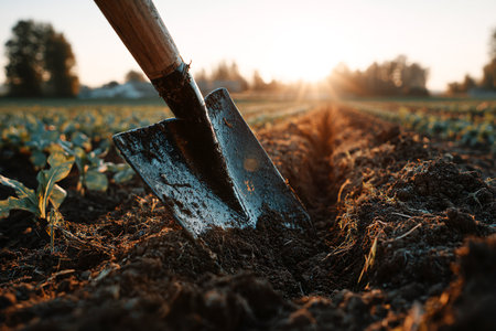 A shovel is plunged into rich soil during sunrise, illuminating a farming field with young plants emerging. The beauty of dawn enhances the agricultural scene.