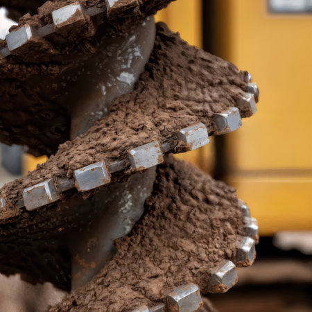 Muddy auger drill bit on heavy construction machinery.