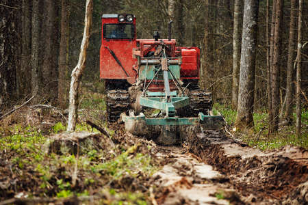 An old red bulldozer is working in the forest. The bulldozer digs the ground.