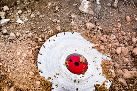Close-up of a rusty shovel in the ground. Construction background