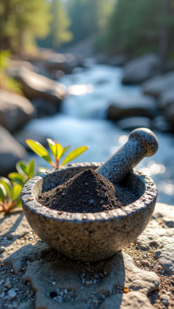 Granite mortar and pestle with black powder by flowing river in sunlit nature. That the image is generated using AI.