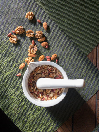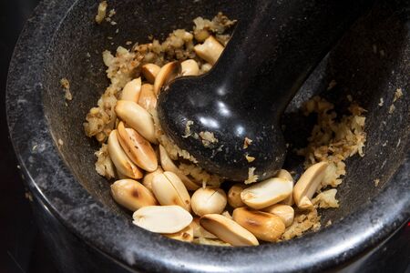 Mashing roasted peanuts with a pestle in a black mortar, to cook Asian satay sauce, selected focus, narrow depth of field