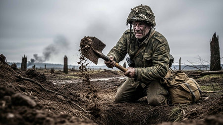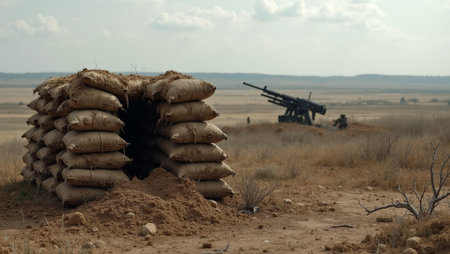 Abandoned sandbags with spilled dirt near old machine gun nest in desolate field