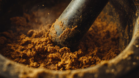 This close-up image captures the intricate texture of freshly ground spices in a mortar and pestle, highlighting the art of traditional culinary preparation.