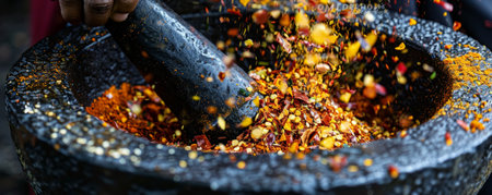 A vibrant mix of spices being prepared in a mortar and pestle. The dynamic colors and textures of the spices, such as red chili flakes and yellow turmeric, create an engaging and aromatic image.