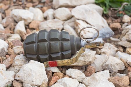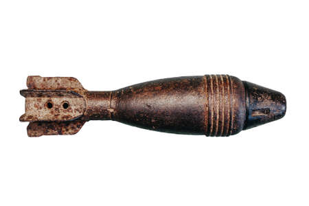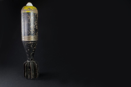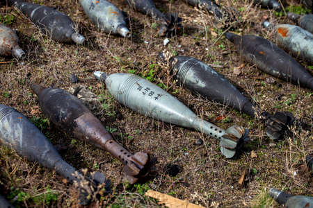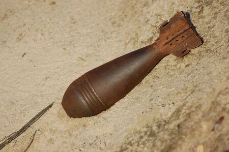 An unexploded mortar mine lying on the rocks. Clearance of unexploded shells after a battle in the war.