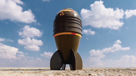 Nuclear bomb, atomic missile on the ground, against a blue cloudy sky, 3d render