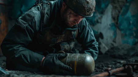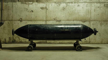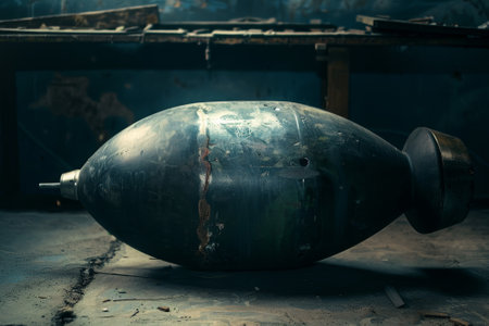 An old unexploded bomb lies on the dusty ground of an abandoned building, surrounded by peeling paint and debris, creating an eerie atmosphere in low light.