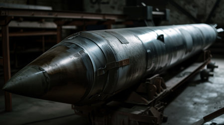 A powerful image of a nuclear bomb on display at a museum in Gdansk. The massive metal rocket is a chilling reminder of the old atom era and the devastating potential of war.