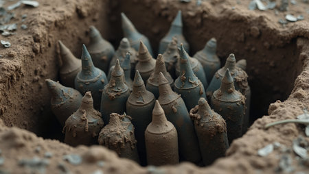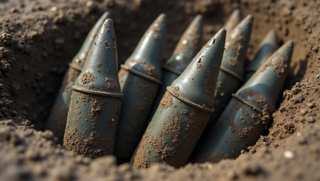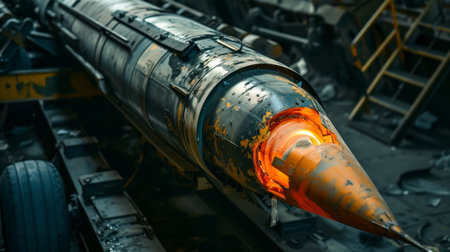 Concentric arrangement of stacked warheads creates a powerful abstract, perfect for conceptual illustrations about defense, aggression, or arms development. Great detail and dramatic perspective.