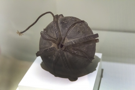 Sevastopol, Crimea, Russia - July 28, 2020: Marine galvanic impact anchor mine of the 1908/1939 model in the memorial complex Sapun Gora in the hero city of Sevastopol, Crimea