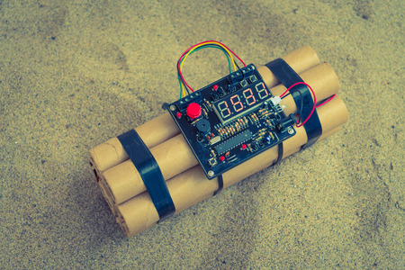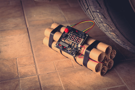 TNT time bomb near wheel of car ( Filtered image processed vintage effect. )