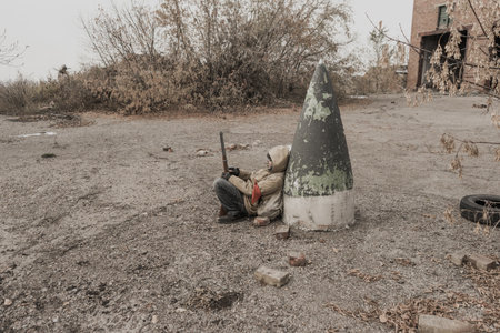 wandering boy. boy with a gun. boy goes to an abandoned building. boy stands in front of a building. Post apocalypse. man traveling on foot in a post-apocalyptic world in search of food