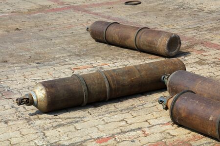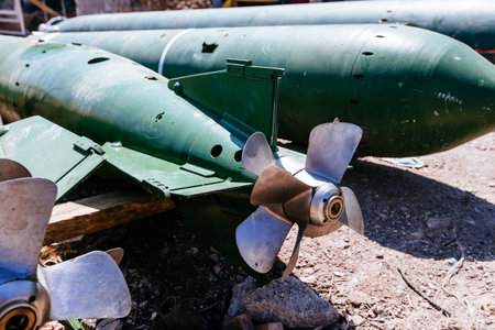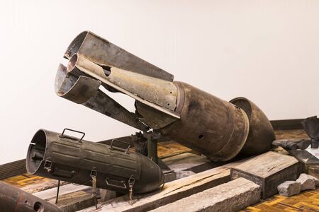london, england, 05/05/2018 A collection of old vintage antique world war 2 missile bombs. bombs dropped from planes over cities. german bombs and bombing weapons.