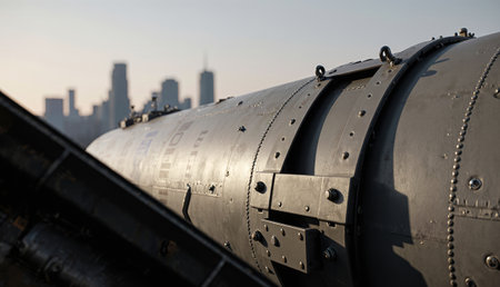 A large military artillery piece stands prominently with a city skyline behind it during late afternoon. The scene highlights a blend of history and modernity in an urban setting.
