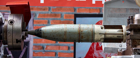 A large, rusted missile is clamped securely within a metal vise. The missile is partially visible, with the front end protruding towards the viewer. The vise is situated in front of a brick wall, with a red and white poster partially visible in the background.