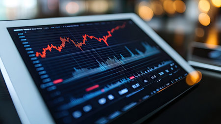 Detailed shot of a stock chart with market trends and performance metrics displayed on a tablet or laptop