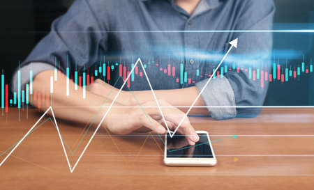 Man using smartphone trading business stock or bitcoin graph. Crypto currency growth in blockchain technology.