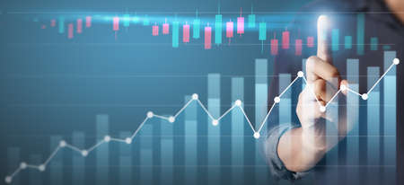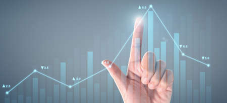 Businessman hand touching stock market graph chart gain profit , Business investment planing growth and economic increasing strategy concept.
