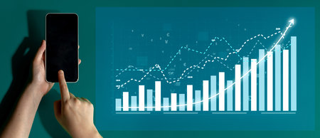Businessman hand holding smartphone with increasing virtual investment graph and chart for stock market analysis trend and technical by trader concept.