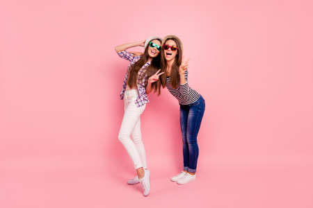 Full length body size photo of funny crazy childish people having caps weekends rest holidays making v-signs laughing isolated wear jeans checkered blouses on pastel background