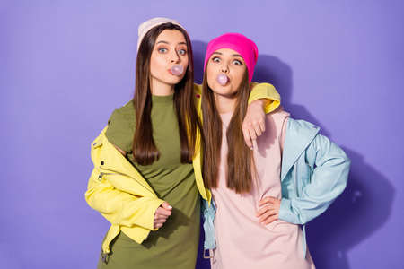 Two cute young women dressed in 90s style fooling around on purple background.